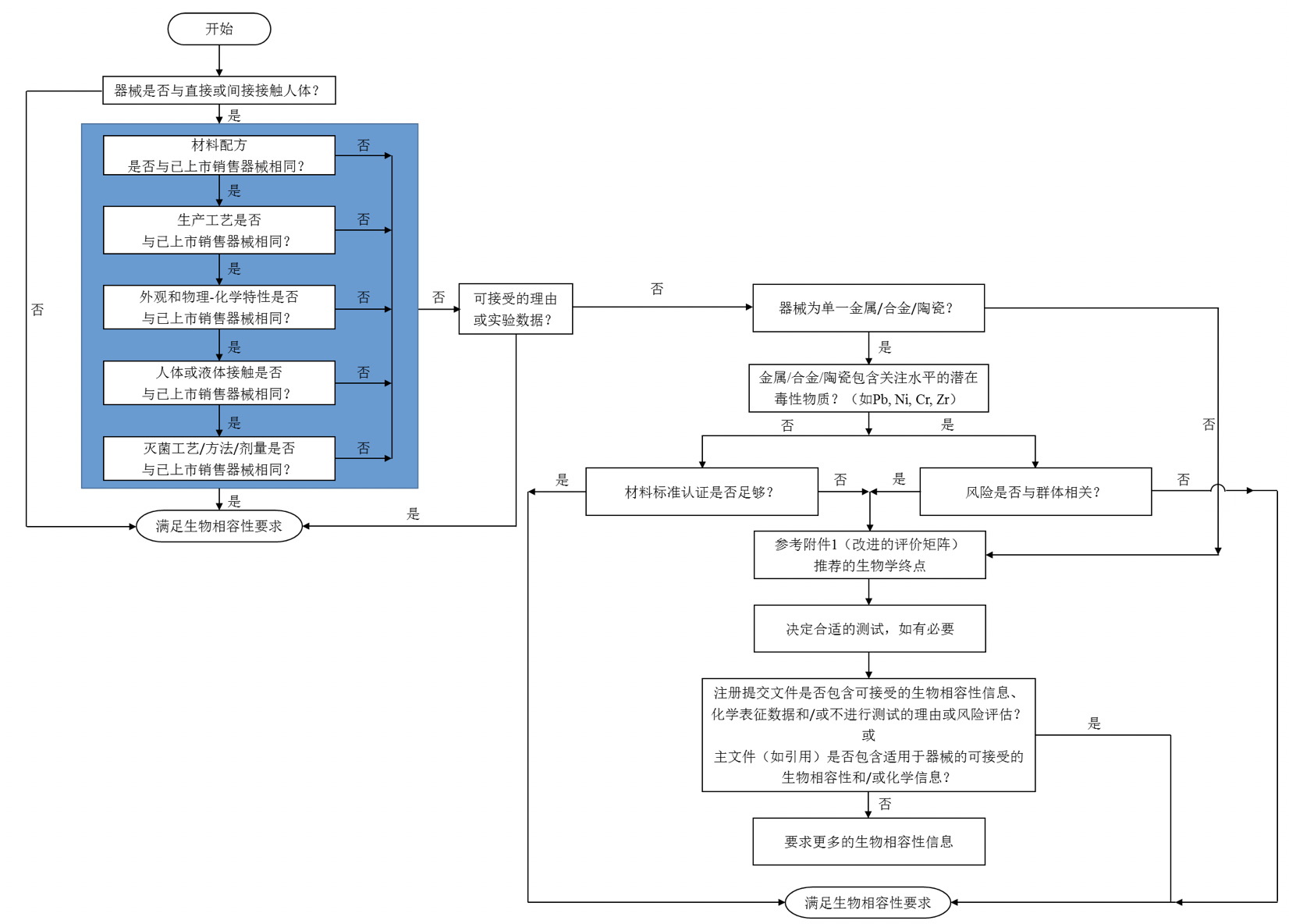 下述为用于进行生物相容性评价的框架而不是试验清单。针对特定医疗器械,要求对不同的生物学终点进行评价,包括附加终点或比适用终点更少的终点。如果不清楚器械的类别,建议查阅特定器械指导原则或联系合适的审核部门以获取更多信息。
